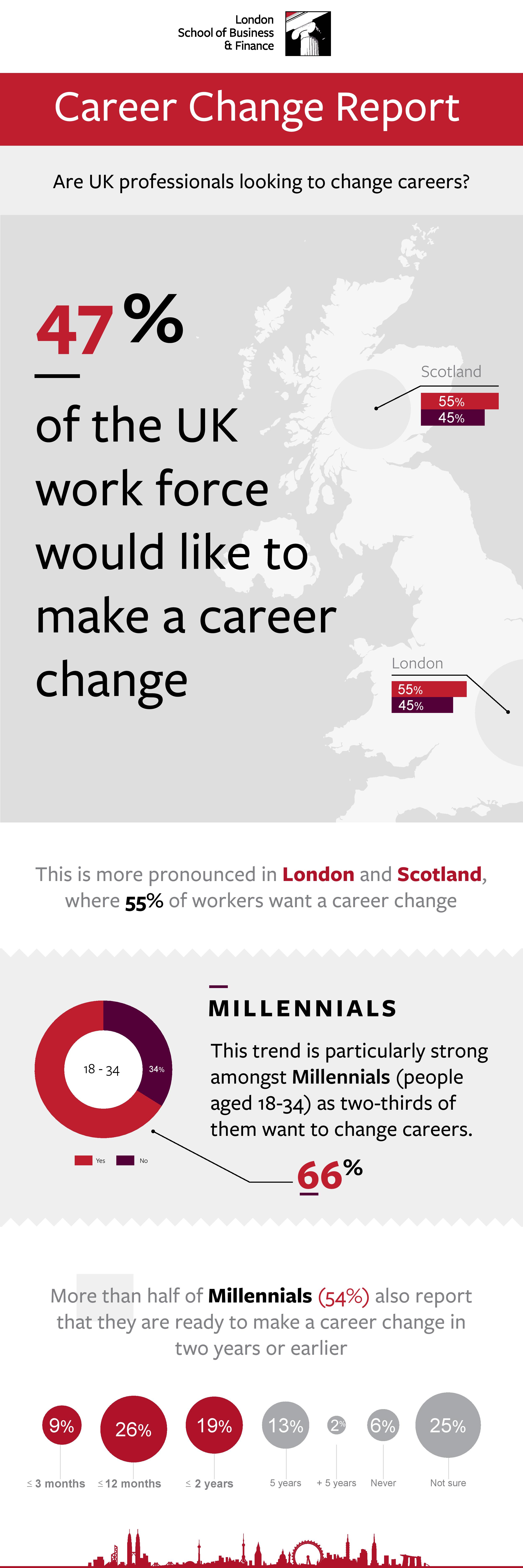 Our friends over at the London School of Business & Finance sent us the results of their latest study last week and frankly, we weren’t surprised. With 47% of employed people within the UK wanting a career change and a whopping 55% of Londoners wanting to change career, the stats confirm what we hear every day, many people are in ill-fitting professions, uncomfortable work environments and dissatisfied with their working lives. 66% of millennials, people in their ’20s and ’30s, aren’t currently satisfied and want to change career, that’s two thirds, staggering! According to The London School of Business & Finance, many people realise they want change, the majority (25%) in the next 12 months, but are often afraid to leave and aren’t sure how to take the steps to make change a better reality.